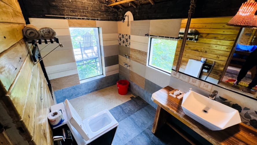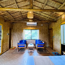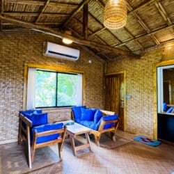 The Deluxe Cottage Double offers a perfect blend of comfort and nature, featuring a spacious king-size bed for double occupancy. Designed for a relaxing stay, the cottage comes with air conditioning, a private balcony with scenic views, and 24/7 power backup to ensure uninterrupted comfort. Guests can enjoy modern amenities like a LED TV with cable, a mini-fridge, and a tea/coffee setup for added convenience. The ensuite bathroom is equipped with hot and cold water along with branded toiletries, providing a refreshing and luxurious experience amidst nature.